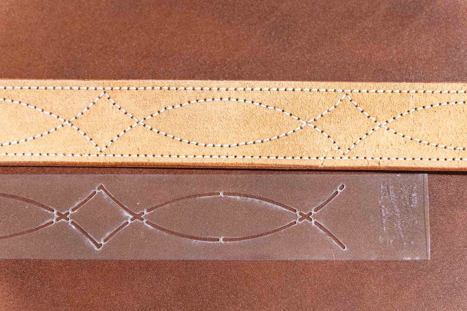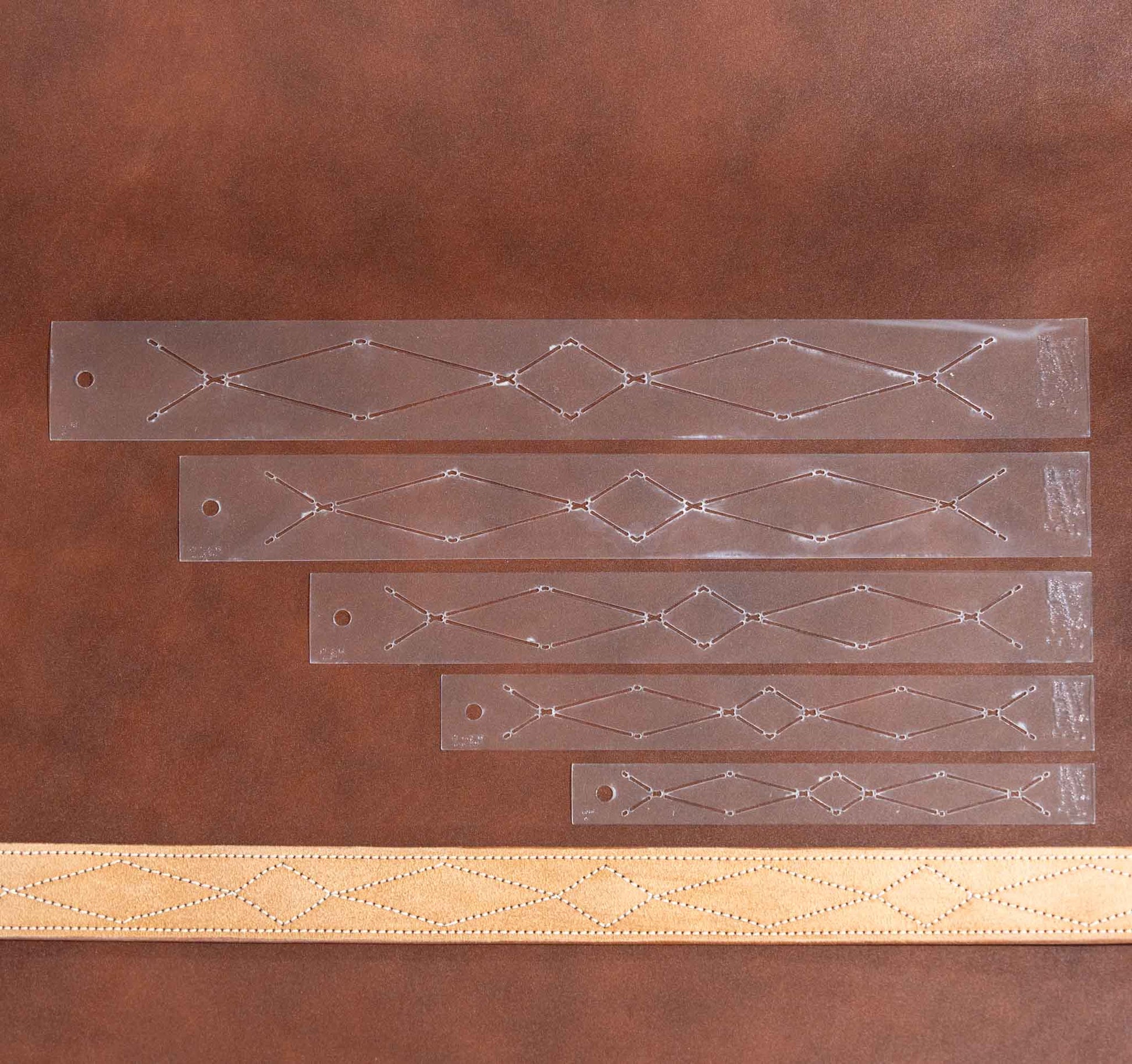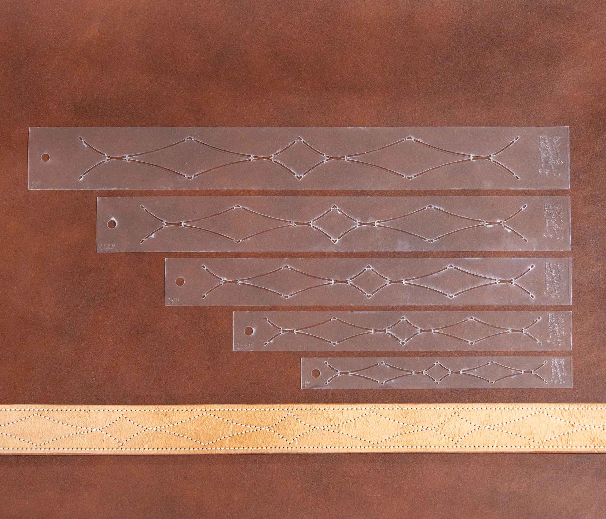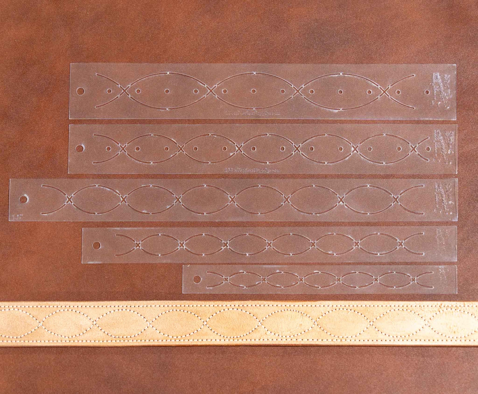 The first time I remember seeing the gun belt stitch pattern was on trips to Uncle Wilbur’s saddle shop when I was a young kid. Pictured with our five sizes of belt stitch patterns is one of Wilbur’s original cardboard patterns. This set of five stencils includes 1”, 1.25”, 1.5”, 1.75”, and 2” sizes. Our 2” also has holes spaced 1” apart and works great for back billets.